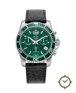 A Dive watch with a vintage-inspired 36.5mm case, crafted from stainless steel featuring a green dial with a unique sunburst finish.