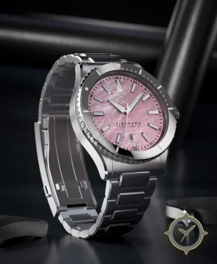 A Dive watch with a versatile 41mm case, that suits most wrists, crafted from stainless steel featuring a white dial with a unique mother-of-pearl (pink iridescent) finish.