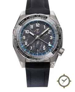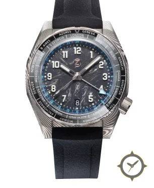 A GMT watch with a versatile 38mm case, that suits most wrists, crafted from stainless steel featuring a navy dial with a unique marbled finish, perfect for the global traveler with its world-time function.