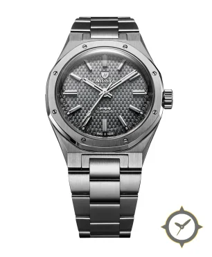 A Luxury watch with a bold 43.5mm presence on the wrist, crafted from stainless steel featuring a gray dial with a unique carbon-fiber weave finish.