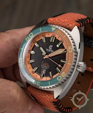 A Dive watch with a bold 48.5mm presence on the wrist, crafted from stainless steel featuring a black dial with a unique grained matte with contrasting orange chapter ring finish.