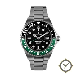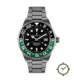 A GMT watch with a vintage-inspired 36.5mm case, crafted from stainless steel featuring a black dial with a unique matte finish and a true GMT complication for tracking a second time zone.