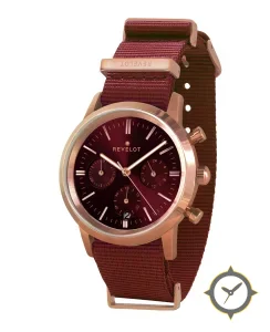 A Chronograph watch with a vintage-inspired 30.5mm case, crafted from gold featuring a crimson dial with a unique sunburst finish.