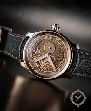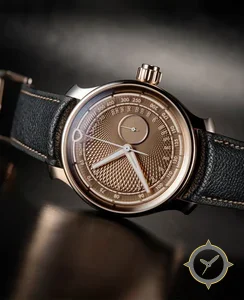 A Dress watch with a vintage-inspired 31.5mm case, crafted from gold featuring a brown dial with a unique guilloché (engine-turned) radial texture finish.