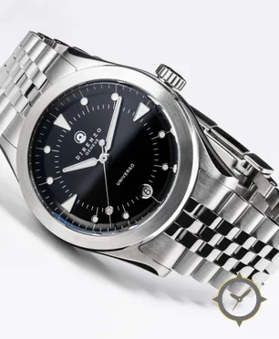 A Sports watch with a vintage-inspired 36mm case, crafted from stainless steel featuring a black dial with a unique sunburst finish.