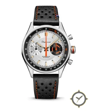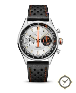 A Racing watch with a versatile 40mm case, that suits most wrists, crafted from stainless steel featuring a silver dial with a unique brushed sunburst finish.