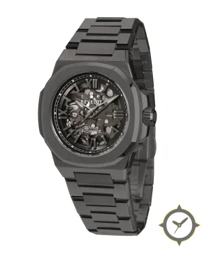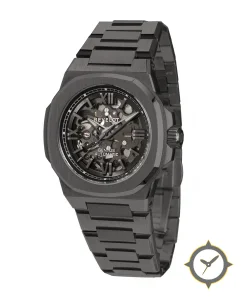 A Skeleton watch with a bold 43.5mm presence on the wrist, crafted from stainless steel featuring a black dial with a unique openworked/skeleton finish.