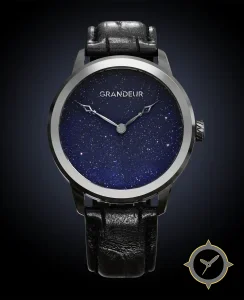 A Minimalist watch with a vintage-inspired 32.5mm case, crafted from stainless steel featuring a navy dial with a unique aventurine (sparkling, starry) finish.