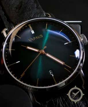 A Dress watch with a vintage-inspired 30.5mm case, crafted from stainless steel featuring a green dial with a unique sunburst finish.