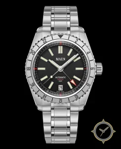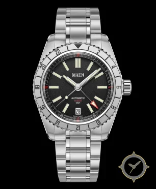 A GMT watch with a bold 42mm presence on the wrist, crafted from stainless steel featuring a black dial with a unique matte grained finish and a true GMT complication for tracking a second time zone.
