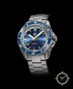 A Dive watch with a vintage-inspired 37.5mm case, crafted from stainless steel featuring a blue dial with a unique sunburst finish.