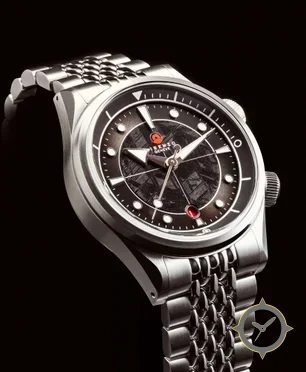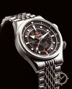 A Dive watch with a vintage-inspired 34mm case, crafted from stainless steel featuring a black dial with a unique meteorite finish.