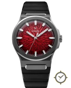 A Sports watch with a vintage-inspired 33mm case, crafted from titanium featuring a red dial with a unique deep relief organic/ripple texture (radial) finish.