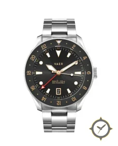 A GMT watch with a vintage-inspired 36mm case, crafted from stainless steel featuring a black dial with a unique sunburst finish and a true GMT complication for tracking a second time zone.