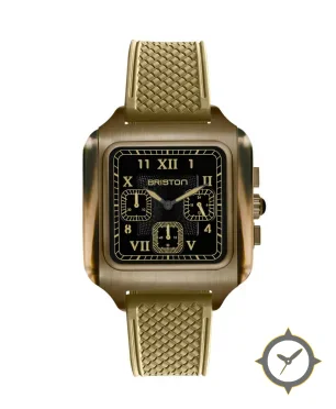 A Chronograph watch with a vintage-inspired 33mm case, crafted from gold featuring a black dial with a unique guilloche/textured center finish.