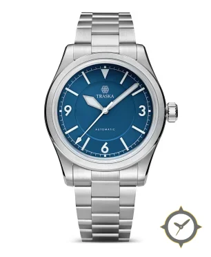 A Field watch with a bold 43mm presence on the wrist, crafted from stainless steel featuring a blue dial with a unique sunburst finish.