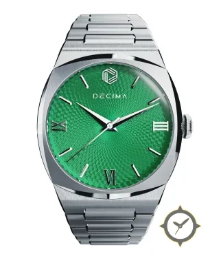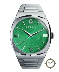 A Luxury watch with a vintage-inspired 37.5mm case, crafted from stainless steel featuring a green dial with a unique guilloché finish.