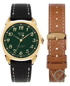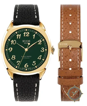 A Dress watch with a vintage-inspired 35.5mm case, crafted from gold featuring a green dial with a unique matte, slightly grained finish finish.