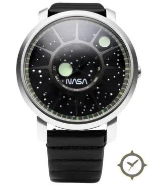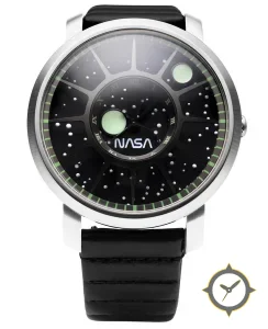 A Minimalist watch with a bold 51.5mm presence on the wrist, crafted from stainless steel featuring a black dial with a unique speckled star-field (textured with small raised dots) finish.