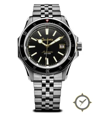 A Dive watch with a bold 45.5mm presence on the wrist, crafted from stainless steel featuring a black dial with a unique lacquer (glossy) finish.