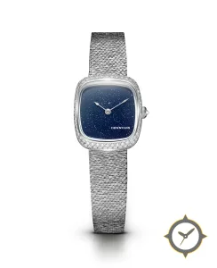 A Dress watch with a vintage-inspired 36mm case, crafted from stainless steel featuring a blue dial with a unique aventurine (sparkling) finish.