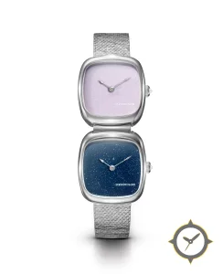 A Dress watch with a versatile 40mm case, that suits most wrists, crafted from stainless steel featuring a blue dial with a unique dual-dial: top matte/textured (light lavender), bottom aventurine-like sparkle (starry) finish.