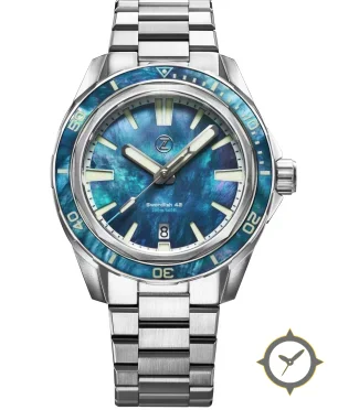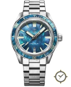 A Dive watch with a versatile 39.5mm case, that suits most wrists, crafted from stainless steel featuring a blue dial with a unique mother-of-pearl / iridescent finish.