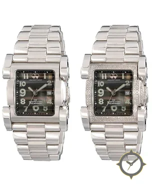 A Luxury watch with a vintage-inspired 32mm case, crafted from stainless steel featuring a black dial with a unique mother-of-pearl finish with subtle horizontal striping finish.