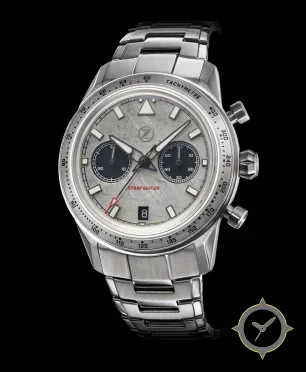 A Chronograph watch with a vintage-inspired 36mm case, crafted from stainless steel featuring a gray dial with a unique meteorite-like scratched texture finish.