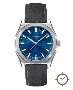 A Sports watch with a vintage-inspired 35mm case, crafted from stainless steel featuring a blue dial with a unique textured guilloché / basket-weave finish finish and a true GMT complication for tracking a second time zone.