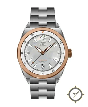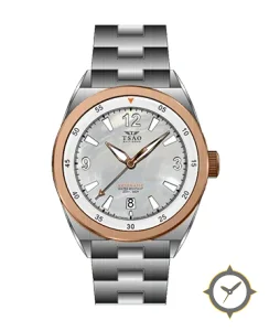 A Luxury watch with a vintage-inspired 36mm case, crafted from stainless steel featuring a white dial with a unique mother-of-pearl (nacre, iridescent) finish.