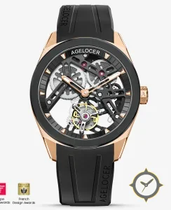 A Skeleton watch with a bold 47mm presence on the wrist, crafted from gold featuring a black dial with a unique open-worked skeleton showing visible gears and movement finish.
