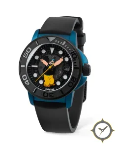 A Dive watch with a versatile 40mm case, that suits most wrists, crafted from stainless steel featuring a black dial with a unique skeleton/open-work showing movement with printed cartoon character motif finish.