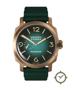 A Military watch with a bold 50.5mm presence on the wrist, crafted from bronze featuring a green dial with a unique fumé / sunburst gradient finish.