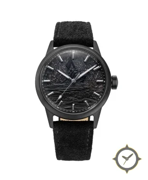 A Minimalist watch, crafted from Coating featuring a black dial with a unique textured relief with granular and sculpted elements finish.