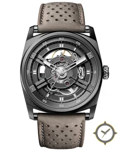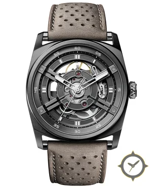 A Skeleton watch with a bold 46mm presence on the wrist, crafted from titanium featuring a gray dial with a unique skeletonized, open-worked, multi-layered finish.