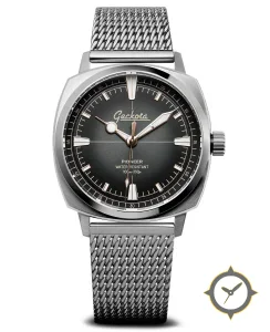 A Vintage watch with a bold 42mm presence on the wrist, crafted from stainless steel featuring a gray dial with a unique fumé (radial gradient) finish.