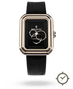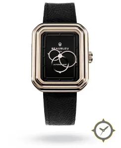 A Dress watch with a vintage-inspired 35.5mm case, crafted from gold featuring a black dial with a unique glossy finish.