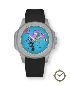 A Sports watch with a vintage-inspired 36mm case, crafted from stainless steel featuring a blue dial with a unique smooth printed lacquer finish.