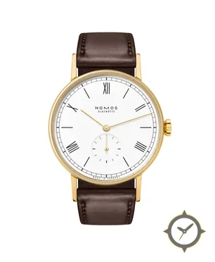 A Dress watch with a vintage-inspired 35mm case, crafted from gold featuring a white dial with a unique lacquer finish.