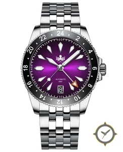 A GMT watch with a vintage-inspired 35.5mm case, crafted from stainless steel featuring a purple dial with a unique sunburst (radial gradient) finish and a true GMT complication for tracking a second time zone.
