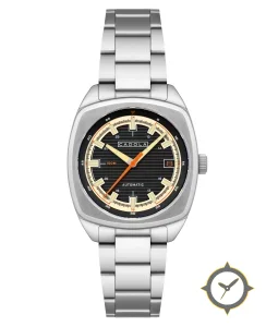 A Sports watch with a bold 43.5mm presence on the wrist, crafted from stainless steel featuring a black dial with a unique horizontal ridges finish.