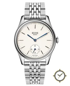 A Dress watch with a vintage-inspired 31.5mm case, crafted from stainless steel featuring a white dial with a unique smooth lacquer finish.