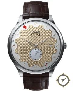 A Dress watch with a bold 48.5mm presence on the wrist, crafted from stainless steel featuring a gold dial with a unique engine-turned guilloché (waffle / clous de Paris) finish.