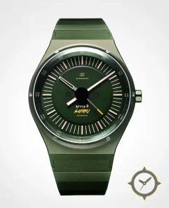 A Racing watch with a vintage-inspired 35mm case, crafted from stainless steel featuring a green dial with a unique matte finish.