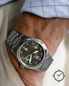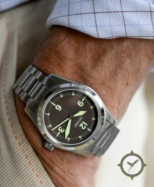 A Field watch with a bold 45mm presence on the wrist, crafted from stainless steel featuring a brown dial with a unique pebbled/grain texture finish.