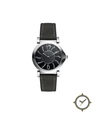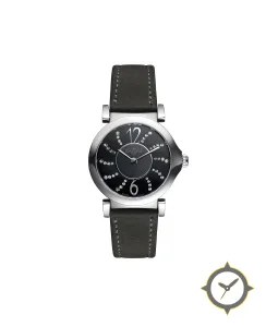 A Dress watch with a vintage-inspired 24.5mm case, crafted from stainless steel featuring a black dial with a unique mother-of-pearl finish.