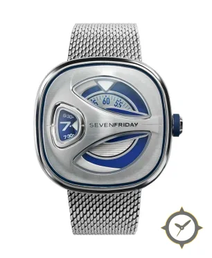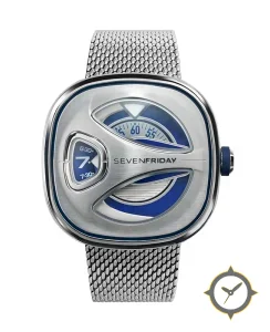 A Luxury watch with a bold 56mm presence on the wrist, crafted from stainless steel featuring a blue dial with a unique brushed metal with layered construction finish.