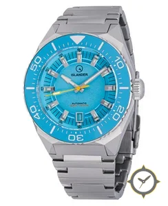 A Dive watch with a bold 46.5mm presence on the wrist, crafted from stainless steel featuring a turquoise dial with a unique sunburst with textured center finish.