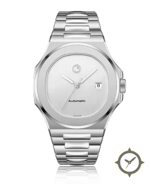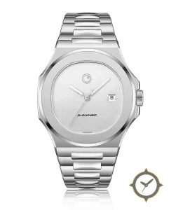 A Luxury watch with a bold 43.5mm presence on the wrist, crafted from stainless steel featuring a silver dial with a unique vertical brushed finish.